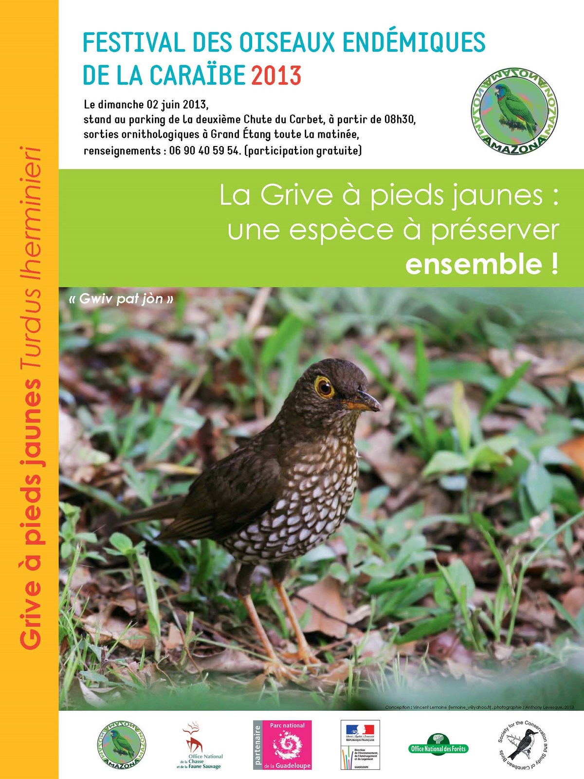 En collaboration avec l'ONCFS et le Parc National de la Guadeloupe, AMAZONA a organisé le 12ème Festival des Oiseaux Endémiques le dimanche 2 juin 2013. Nous avions installé une exposition sur le parking de la 2ème chute du Carbet, et 2 sorties ont été organisées à Grand Etang.