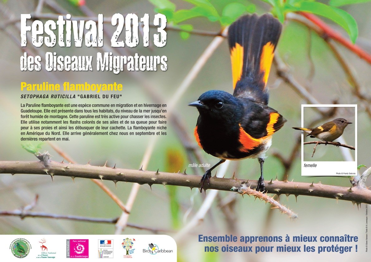 Cette année, nous avons organisé le 8ème Festival des Oiseaux Migrateurs en Guadeloupe, en collaboration avec l'ONCFS et le Parc National de la Guadeloupe. La Paruline flamboyante était mise à l'honneur. Il s'agit d'un petit passereau de la famille des parulidés, qui se reproduit en Amérique du Nord (Canada, Etats-Unis) et qui hiverne en Amérique Centrale, aux Antilles, et au nord de l'Amérique du Sud. Le mâle a des couleurs vives, qui lui permettent d'être facile à identifier.